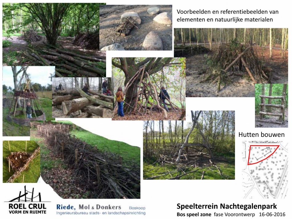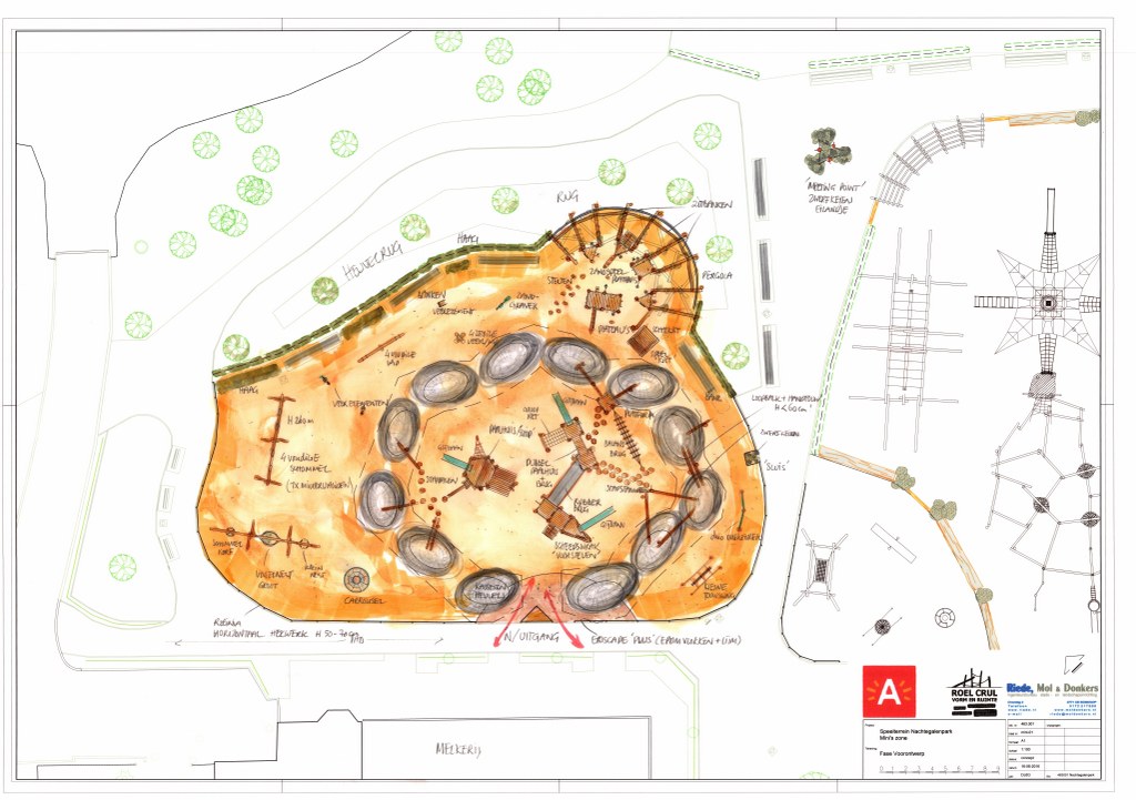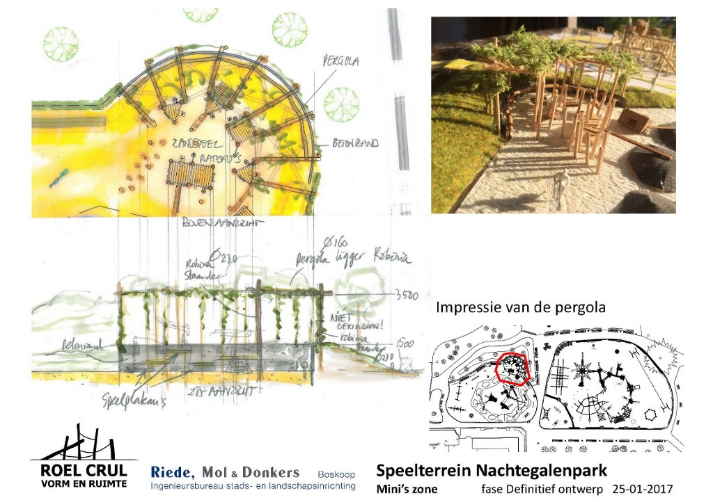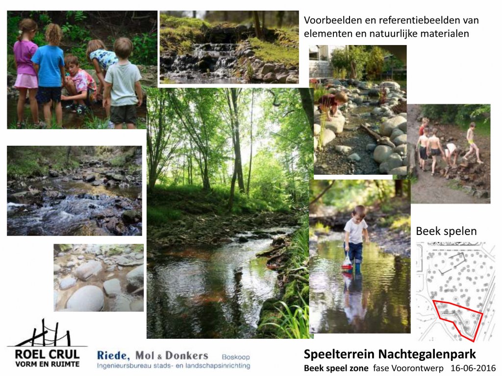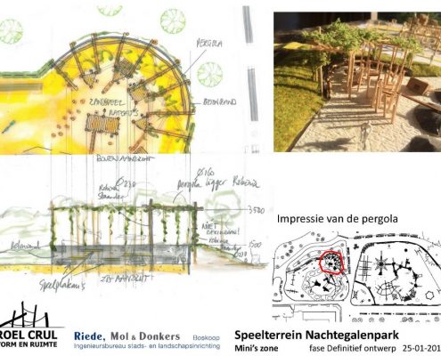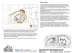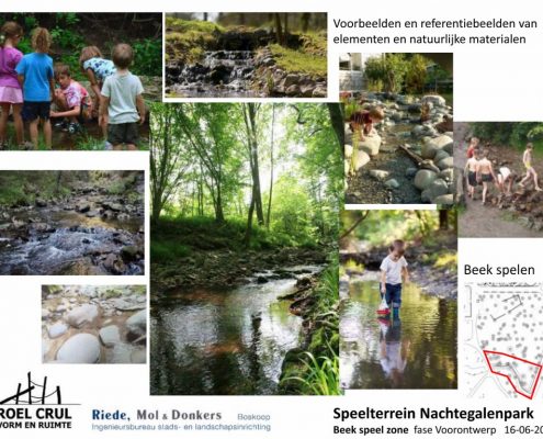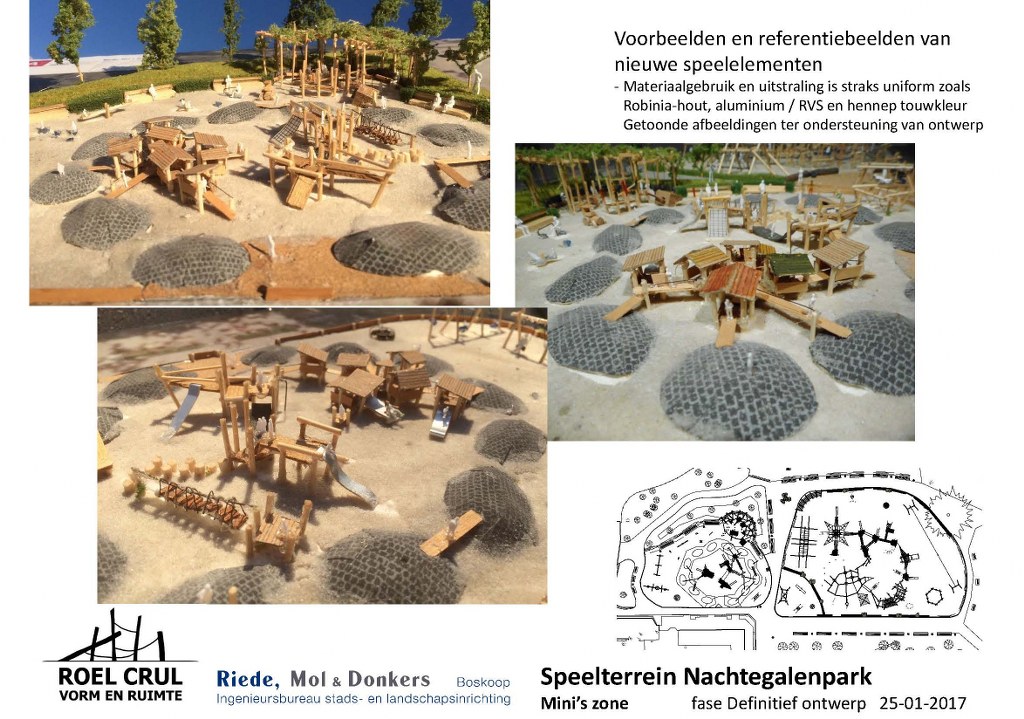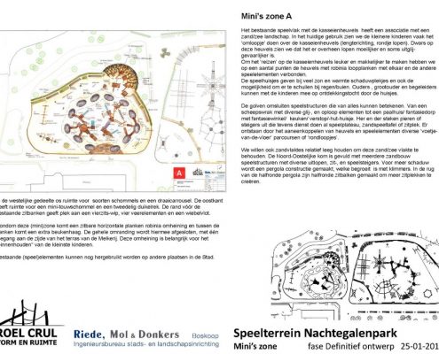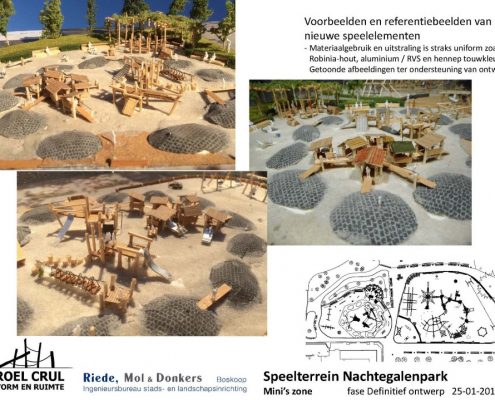 Na de renovatie zal de speeltuin onderverdeeld zijn in een deel voor mini’s, een deel voor de iets oudere jeugd en een deel ingericht als bos-beekspeelterrein. Alsmede toestellen voor minder-validen kinderen worden geïntegreerd in het totale plan. De drie voorlopige ontwerpen ziet u bovenaan in onderstaande galerij.