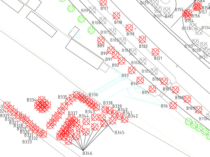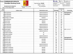 Inventarisatie van bomen op het tracé van de nieuwe zuidelijke rondweg bij Gouda. Van de bomen langs de dijk, in de polder en op de volkstuin zijn de standplaats, de soort en de diameter opgenomen en vastgelegd op tekening en lijst.