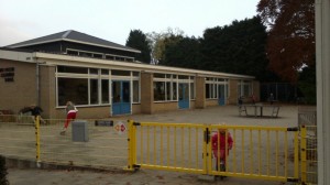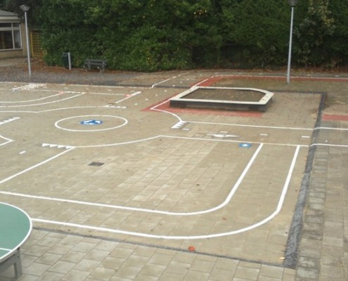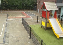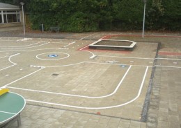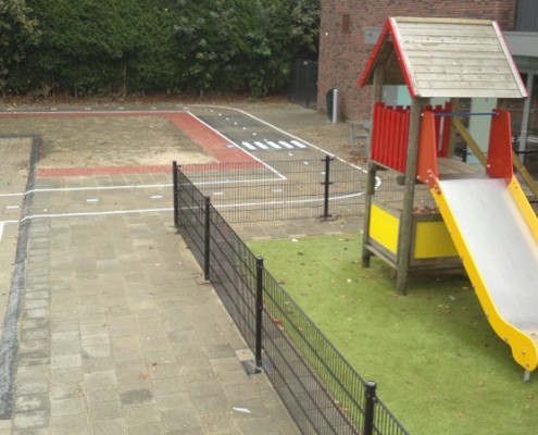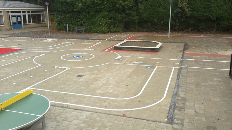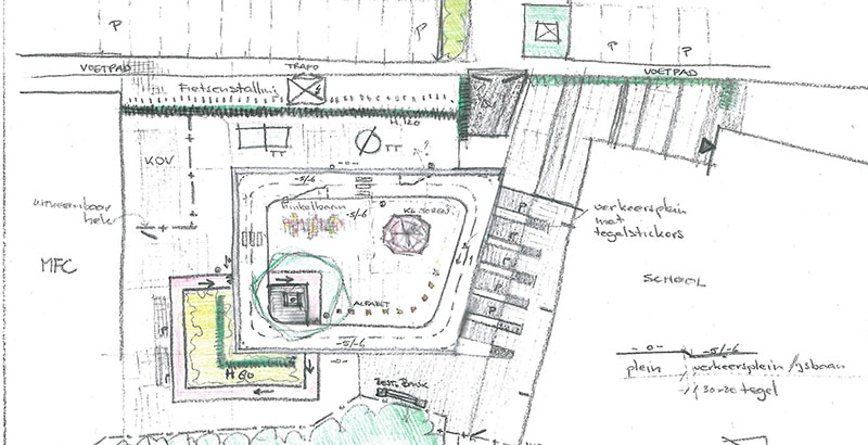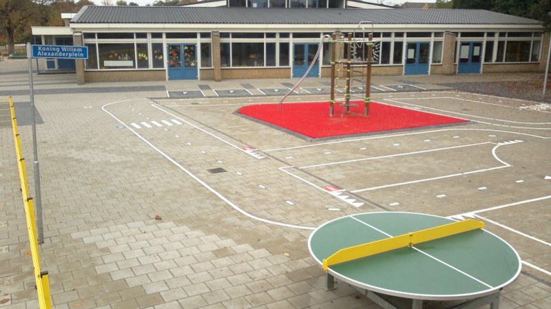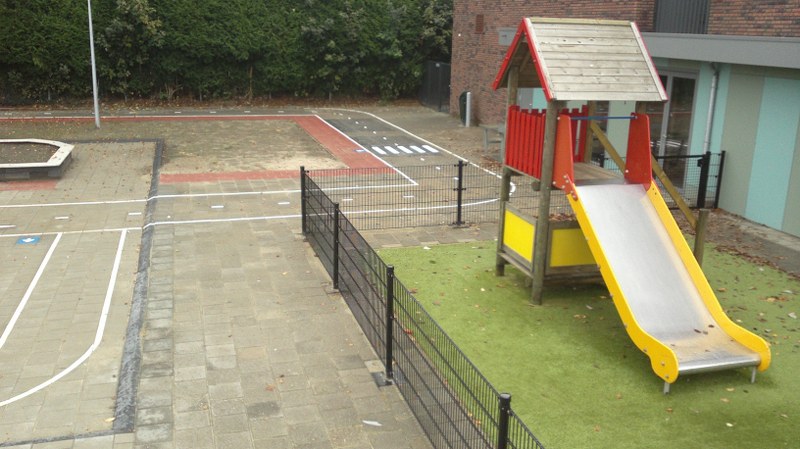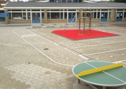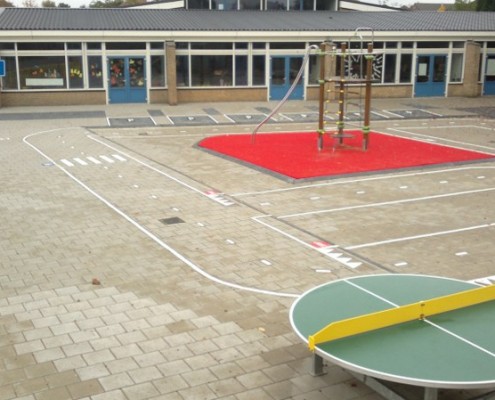 Na nieuwbouw van het MFC is het naast-liggende schoolplein aangepakt. In het midden komt een speel/verkeersplein te liggen. Door de iets verhoogde rand kan dit pleintje ´s winters omgetoverd worden tot een ijsbaantje. Voor de oude speelelementen is op het hogere deel plek ingeruimd.