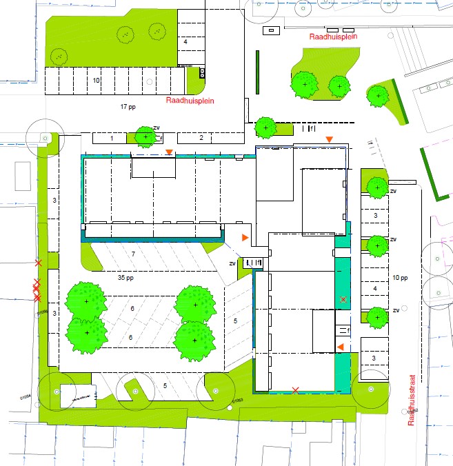 De parkeerplaatsen krijgen hier halfopen verharding om het gebied verder te vergroenen en om regenwater op te vangen. Ook het Raadhuisplein wordt een zo aantrekkelijk mogelijk verblijfsgebied. Veel groen zal hittestress tegengaan.