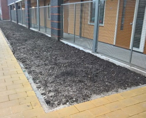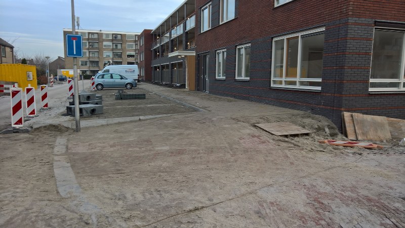 Als de laatste nieuwbouw gereed is, volgt de resterende straatinrichting. Ook hier haaksparkeren aan een zijde, en op het dak van de parkeergarage een siertuin met daarin opgenomen een jeu de boules baan. Een pergola markeert de toegang naar het appartementencomplex.