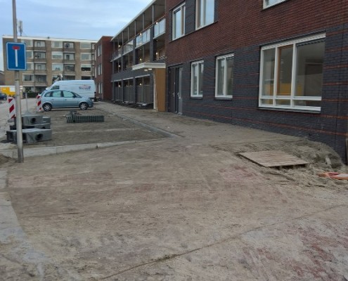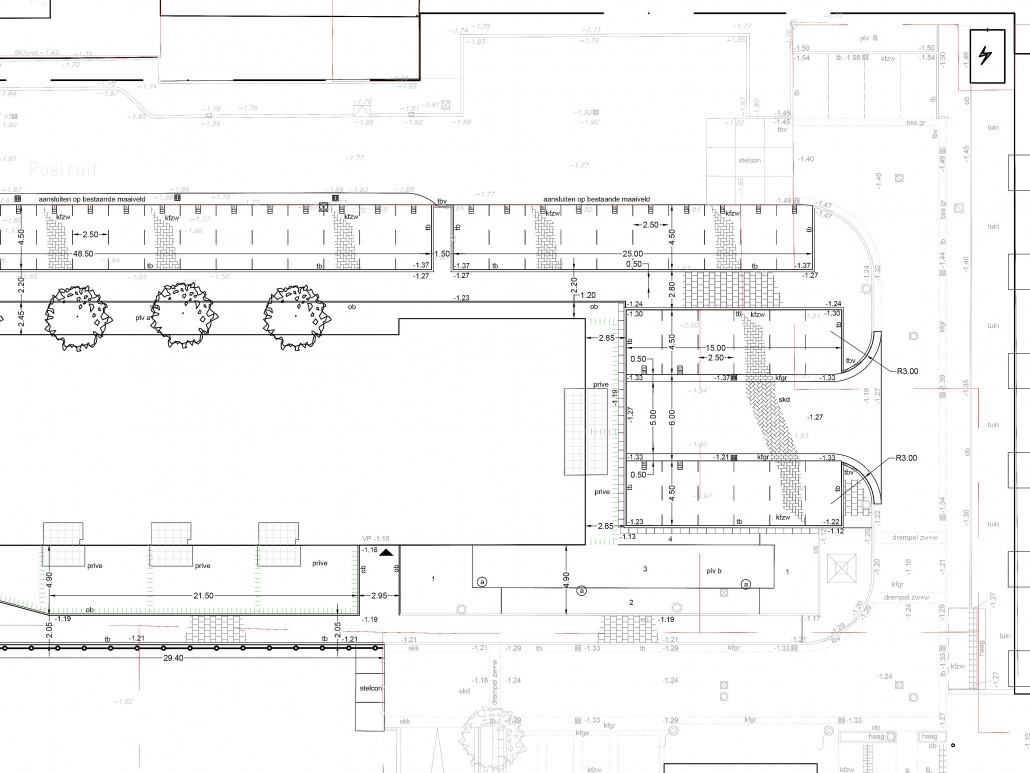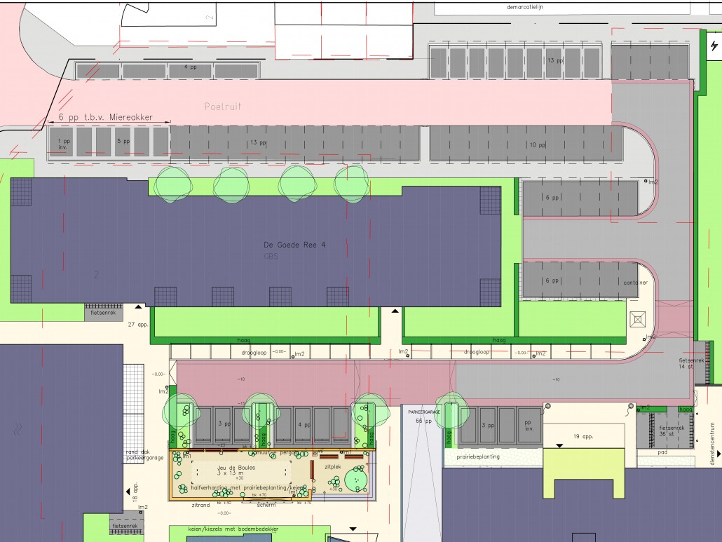 De nieuwbouw van De Goede Ree is nu in fase 3. Dit betekent dat het eerste deel van de straatinrichting uitgevoerd kon worden. De Poelruit wordt uitgebreid met een strook haaksparkeren, waaronder grotendeels privé-parkeerplaatsen (23 van de 29 pp, met een beugel afgeschermd). Op de korte gevel van het appartementengebouw is een parkeerhaven gemaakt; 4 privé en 8 openbaar. Het bijbehorend tekenwerk: opruim-, grondwerk-, uitvoerings-, en rioleringstekeningen hebben we gemaakt.