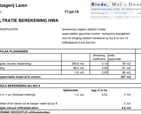 Een onderdeel van onze civiel-cultuurtechnische werkzaamheden is het opstellen van een riool-/waterberging berekening en het daarmee samenhangend rioleringsplan. Gebruikmakend van landelijke neerslagcijfers en/of eisen van de betreffende gemeente komen we tot een verantwoord plan om regenwater op te vangen, te bergen en af te voeren.