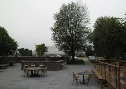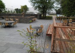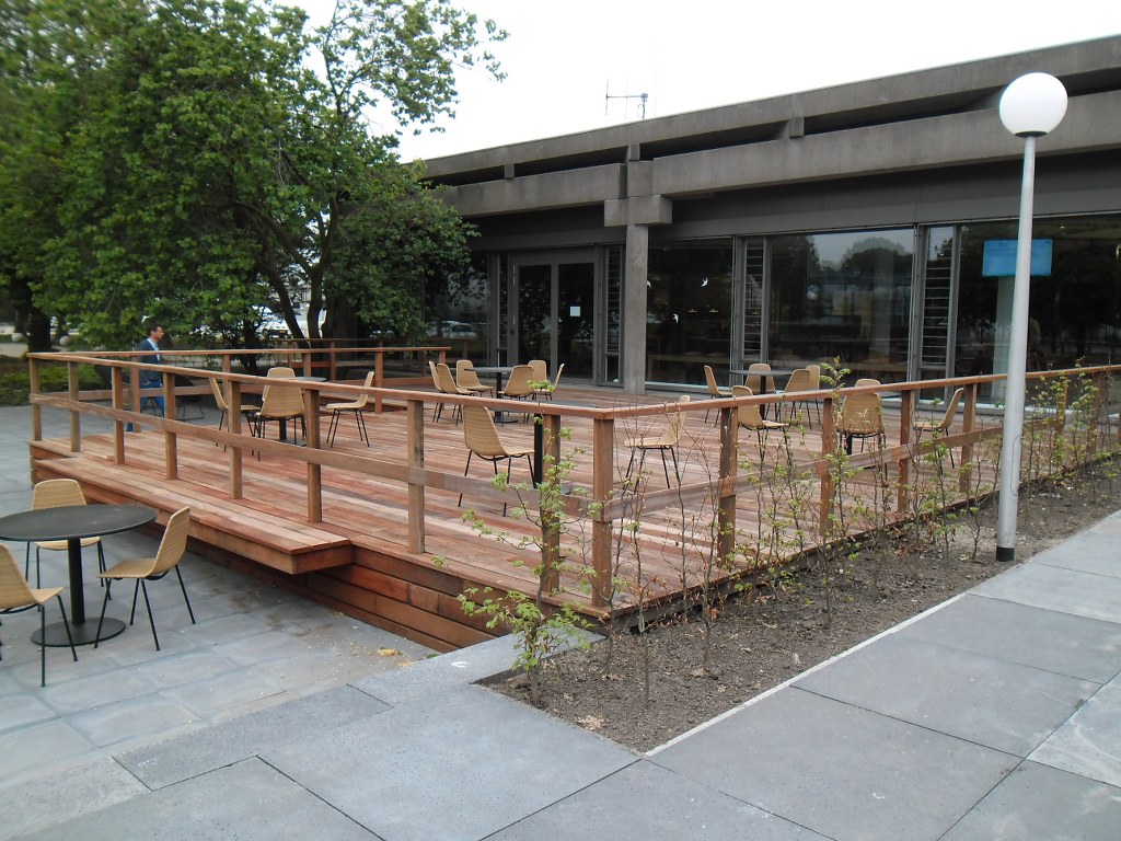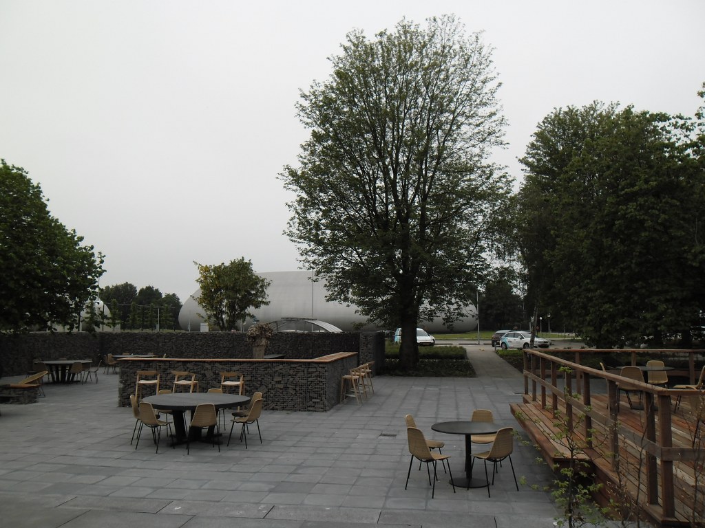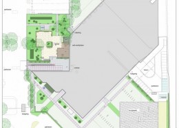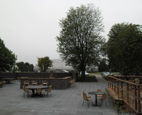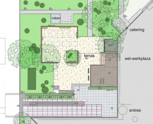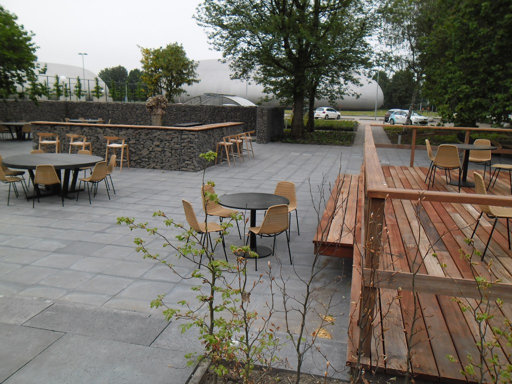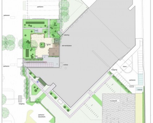 Uit de twee versies is gekozen voor het ontwerp met de strakke lijnen. Het plan voorziet in een ommuurd terras met vlonders aansluitend aan de kantine. De bestaande fietsenstalling en motoroverkapping gaan naar de achterzijde van het gebouw. Aan deze kant ligt eveneens een groot, uit cortenstaal gemaakt kunstwerk. Dit kunstwerk krijgt een omlijsting van leibomen aan de kant van de A16. Tussen kunst en gebouw komt een golvend grasveld, als verwijzing naar de werkzaamheden van Evides. Verder is de terreinindeling rustig gehouden, grote grasvlakte met enkele plantvakken.