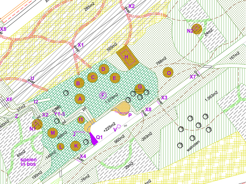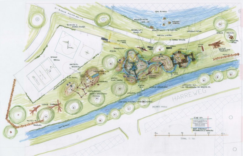 Het huidige open veld mag voor een deel ingevuld worden met een heuvelig speellandschap waar reeds bestaande watergreppels via een omweg doorheen meanderen.