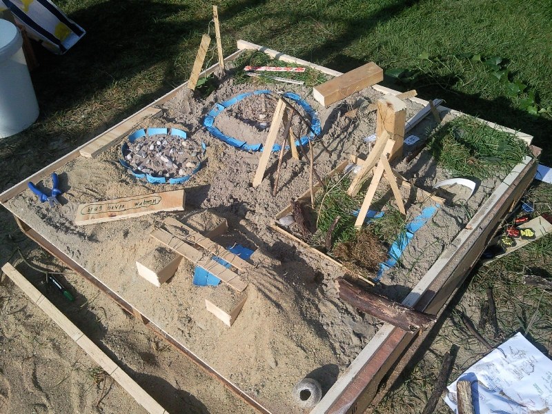De ondiepe waterlopen (tot ca. 25cm waterdiepte) verbreden zich aan de oostzijde van het natuurlijke terras tot een ondiepe plas, die soms droog staat en naar behoefte met regenwater gevuld kan zijn. Dit kan geregeld worden door een handmatig te bedienen sluisje in de afvoerende greppel. Het speelplasje geeft naast het terras de mogelijkheid om een speelstrandje van zand voor de allerkleinsten te realiseren.