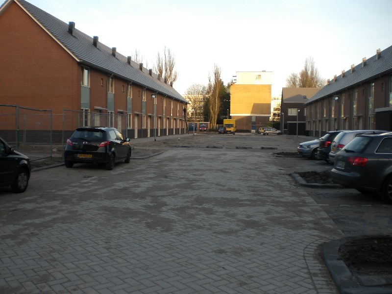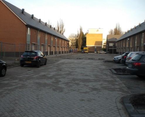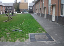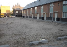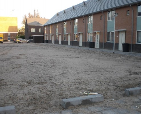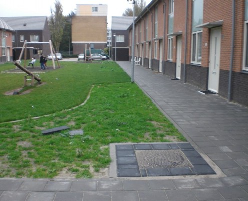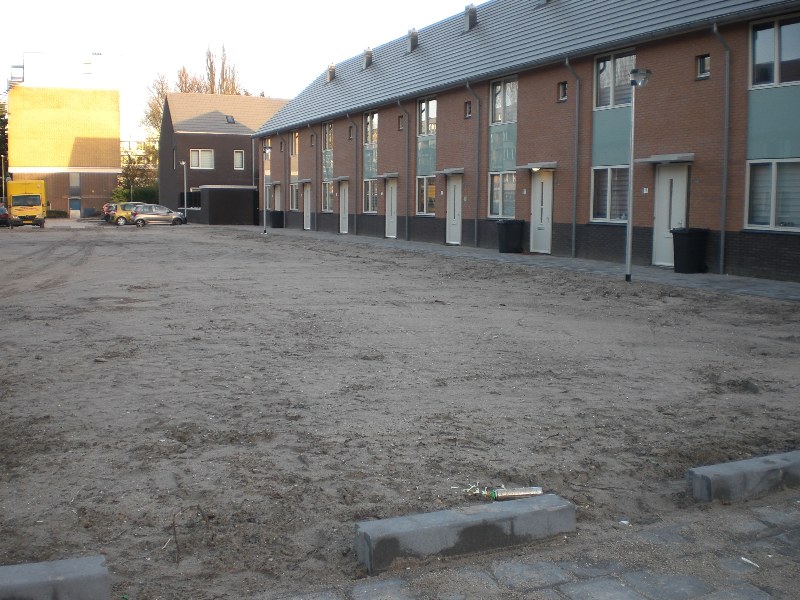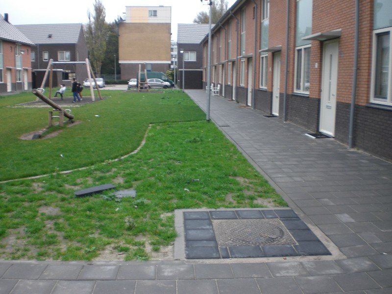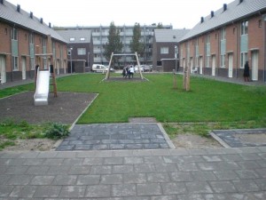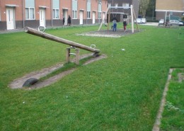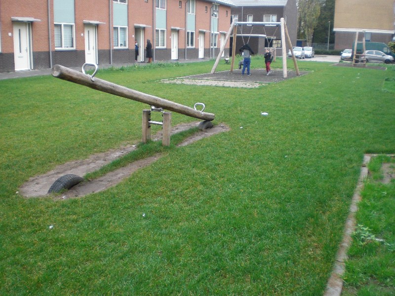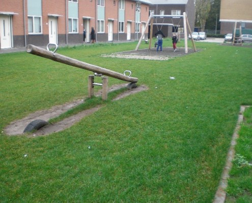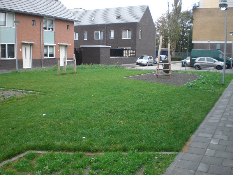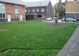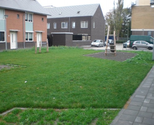De groene ruimte tussen twee rijtjes nieuwbouw woningen is ingericht als speelplek. Omkaderd door plantvakken zijn ondermeer een schommel, een wip en een glijbaan opgenomen. Met bewoners is het project doorgesproken, zijn keuzes gemaakt uit varianten in speeltoestellen en plantsoorten.