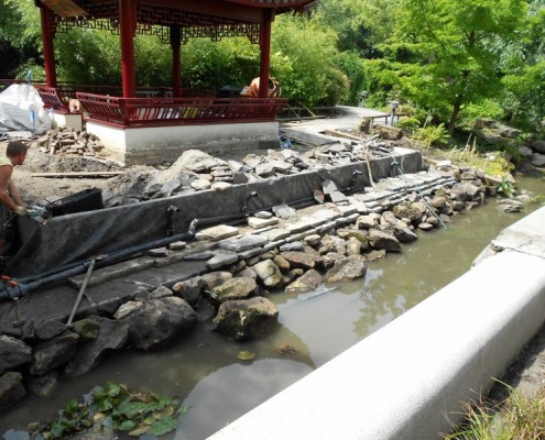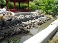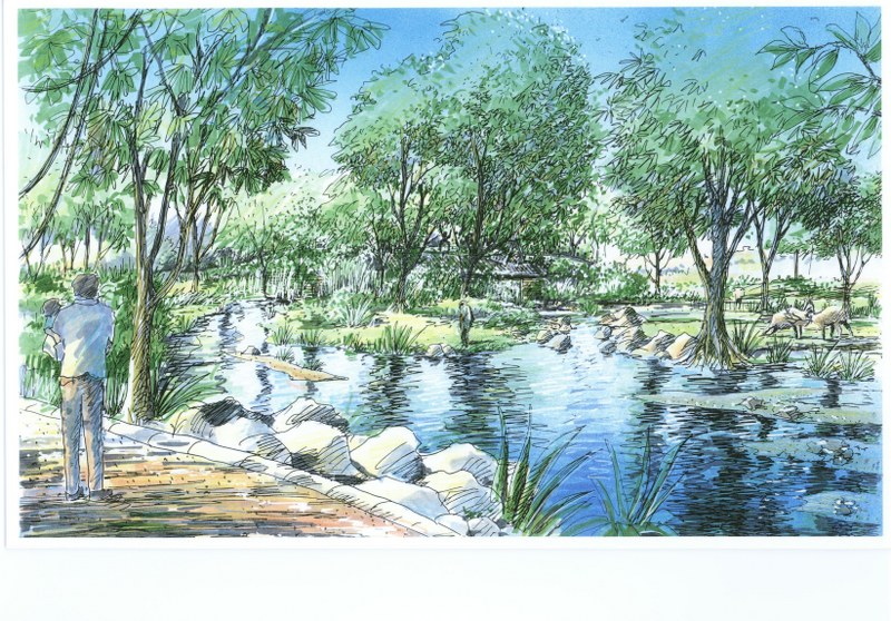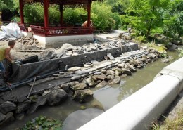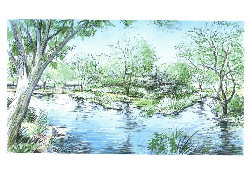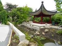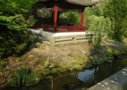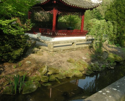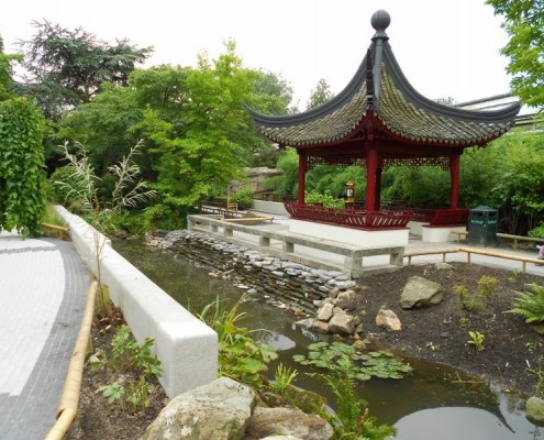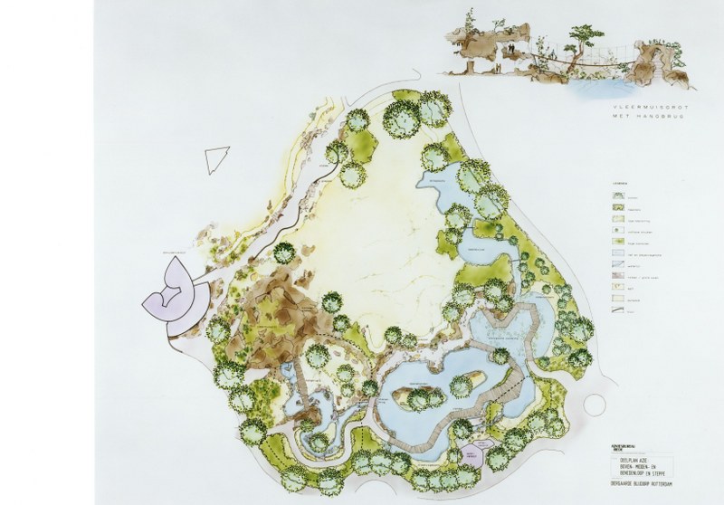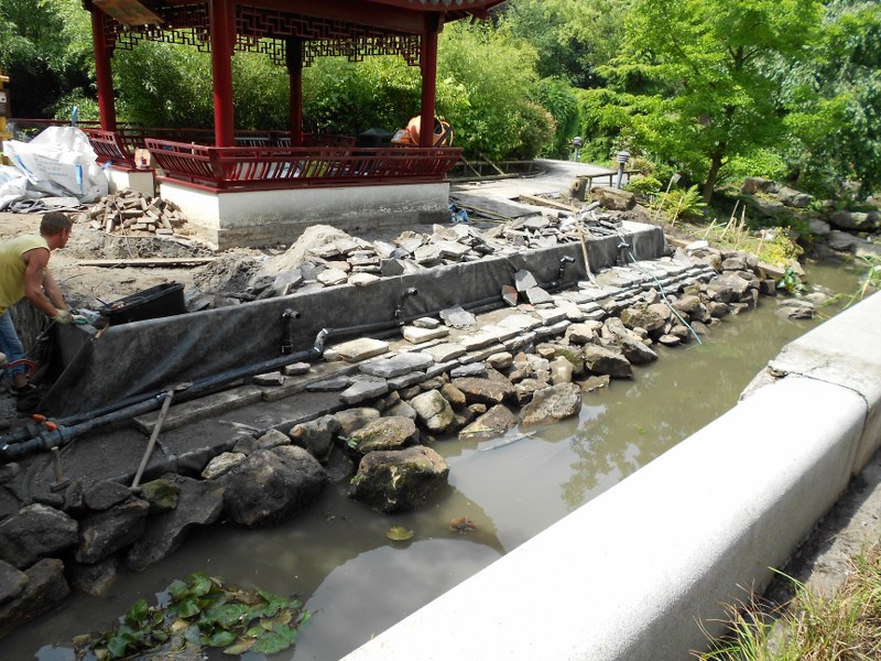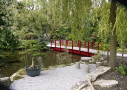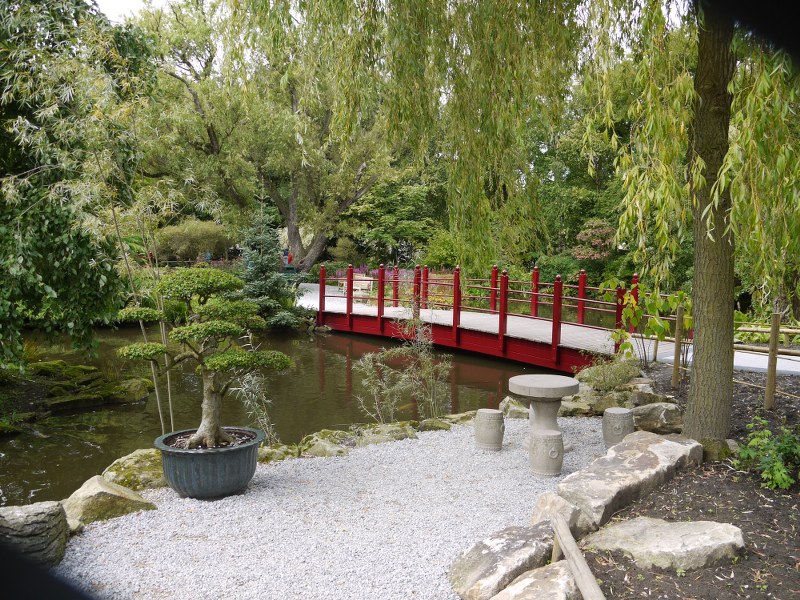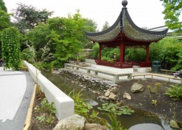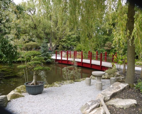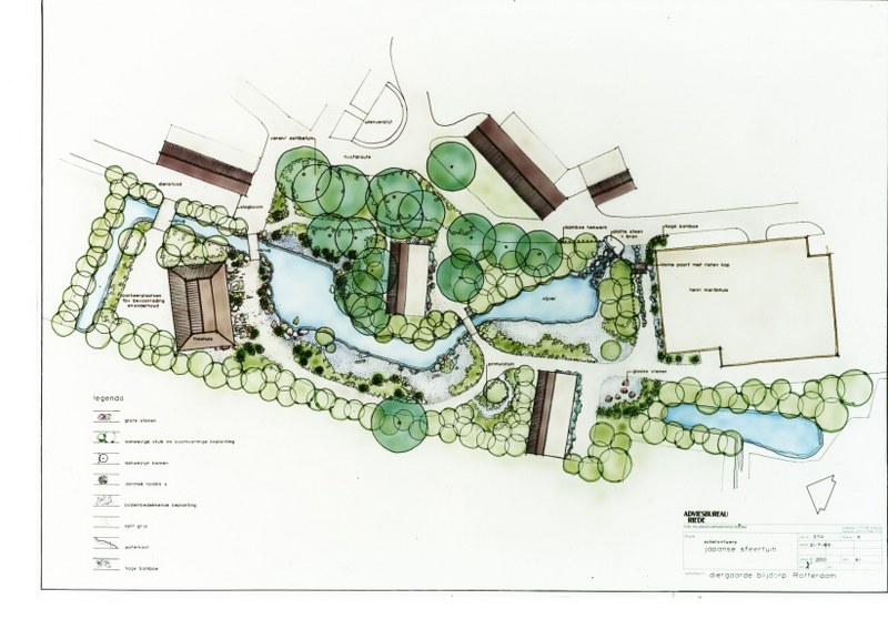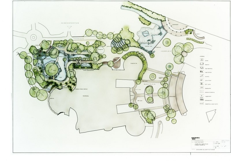Het terrein is in tweeën opgedeeld: hagen en leibomen omzomen het parkeren, in de siertuin zijn split en Gravilyn gecombineerd in grote soepele lijnen. Een grote houten tafel springt in het oog. Een lage schanskorfmuur vormt de grens met de straat. De oude stoomwals op een verhoogd asfaltplateau als eye-catcher.